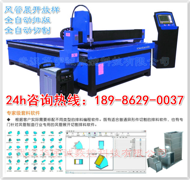 武漢華宇誠數控生產的風管等離子切割機,針對風管展開切割進行了專門優化。切割速度更快、切割精度更高、切割效果更好。并搭配專門的風管展開軟件,用戶只需選擇要切割的風管類型,輸入相應尺寸參數,便可自動排料、自動生成加工程序,用戶直接用U盤在切割機上調入加工程序切割即可。 適合材料有:不銹鋼板、碳鋼板、鋁板、銅板、鍍鋅板、白鐵皮、合金板等多種板材材料,一應俱全!高速等離子切割,切割效果為激光下限!